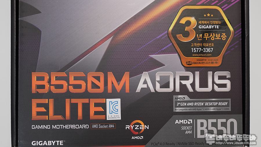 GIGABYTE B550M Aorus Elite 메인보드 패키지를 살펴보면 3년 무상 보증 스티커와 B550M Aorus Elite 모델명과