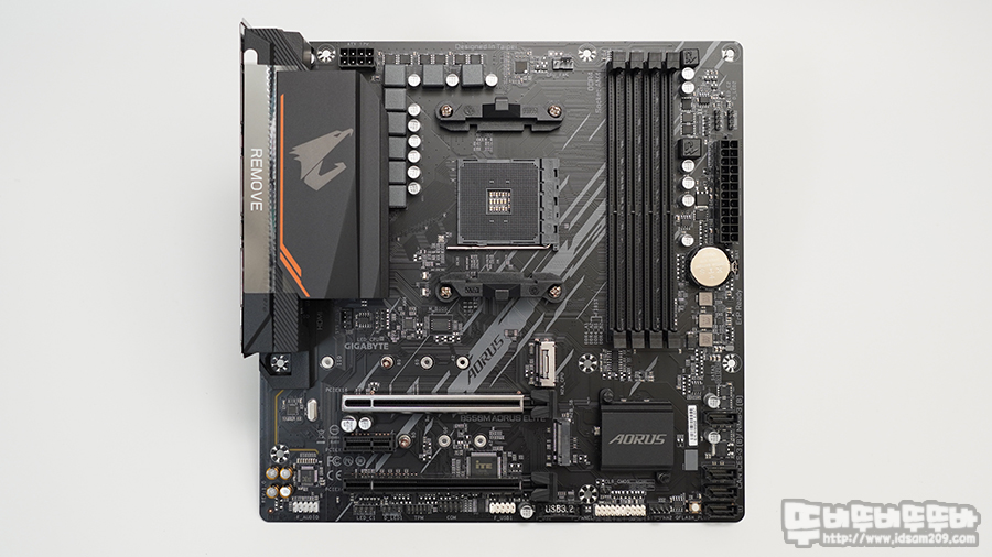 GIGABYTE B550M Aorus Elite 메인보드는 전원부 MOSFET 부분의 Aorus 로고가 인쇄된 히트싱크가 눈에 띄는데 PCIe 4.0을 지원하는 M.2_1 슬롯과 PCIe 4.0 x16 슬롯 부분에 금속 쉴드 처리가 되어있는 게 포인트입니다.