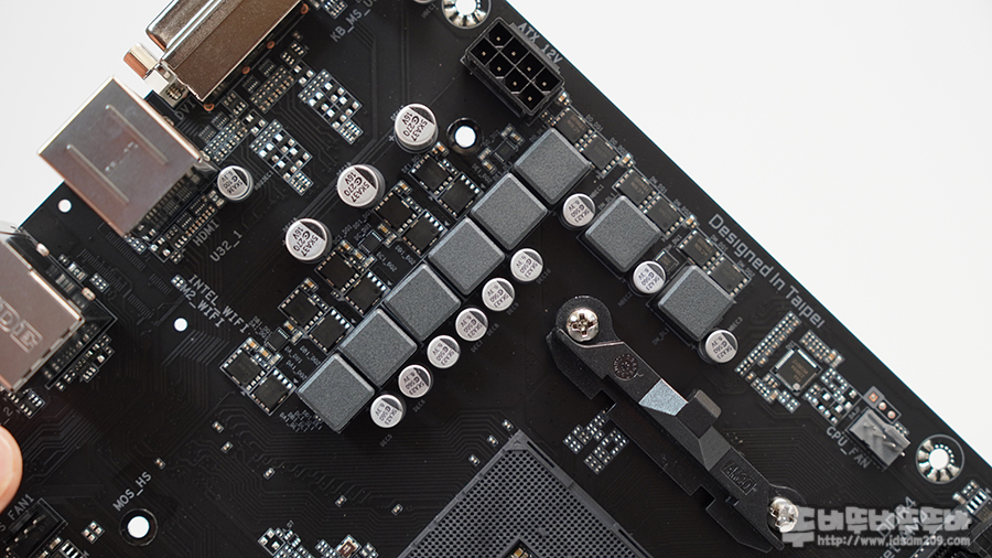 전원부 대형 MOSFET 히트싱크를 제거하며 5 페이즈에 해당하는 MOSFET에만 적용된 것을 확인할 수 있는데 전체적으로 5+3 페이즈 구성의 초크 코일과 Low Ros MOSFETs 그리고 디지털 VRM을 지원하고 있습니다.