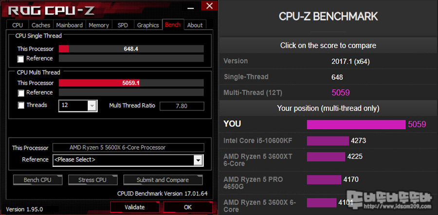 CPU-Z 벤치에서는 싱글 쓰레드는 648.4점, 멀티 쓰레드는 5059.1점을 확인할 수 있습니다.