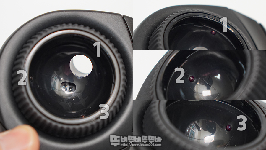 트랙볼이 분리된 내부를 살펴보면 바닥면에 보이는 레이저 센서 부분과 3개의 트랙볼 회전을 담당하는 구슬의 모습을 확인할 수 있는데 이 구슬 부분에 먼지가 자주 끼게 되니 청소를 자주 해주시는 게 좋습니다.