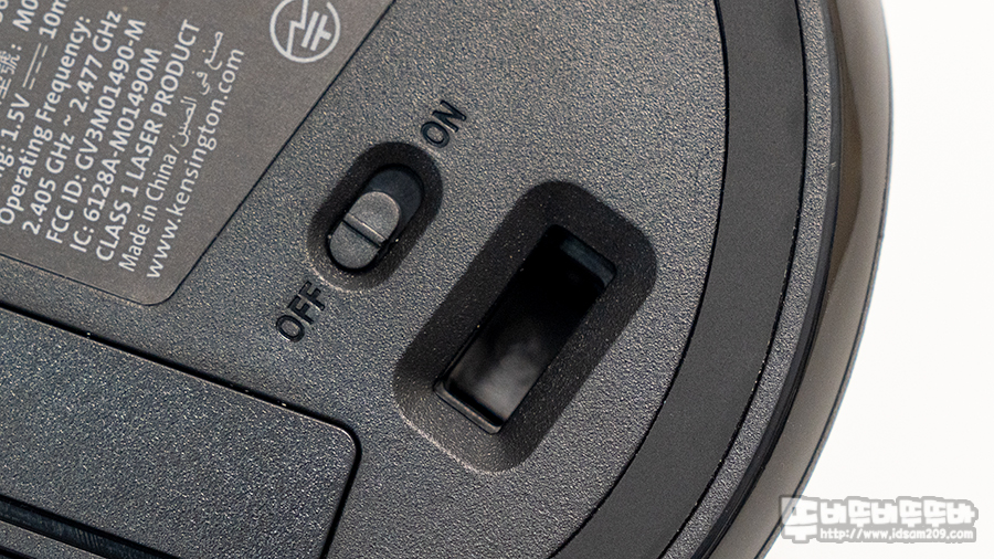 바닥면을 살펴보면 마우스 외곽을 따라 부착된 미끄럼 방지 패드, On/Off 전원 스위치, AA 건전지 소켓, 그리고 무선 리시버를 수납할 수 있는 소켓으로 구성되어있습니다.