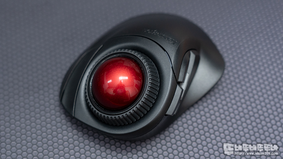 켄싱턴 트랙볼 마우스의 생명이라 할 수 있는 트랙볼 주변의 스크롤 다이얼 그리고 우측에 위치한 마우스 오른쪽 버튼 모습.