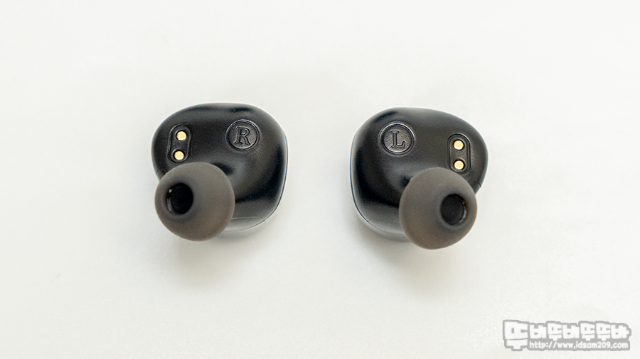브리츠의 시그니처 로고와 엣지 부분에 마이크 모습 귀에 착용되는 안쪽 부분에 좌우를 구분하는 R/L 각인과 충전용 금속 접점을 확인할 수 있습니다.