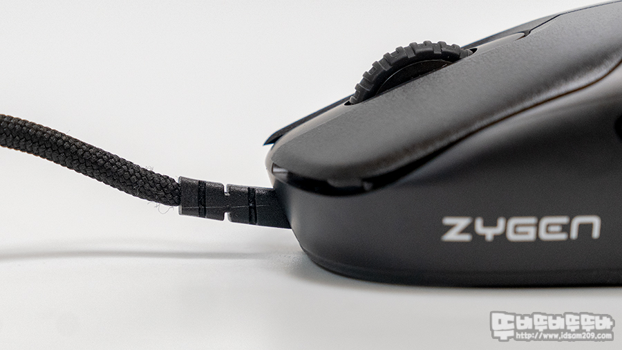 마우스 왼쪽 측면의 사이드 버튼과 ZYGEN 모델명 각인 모습.