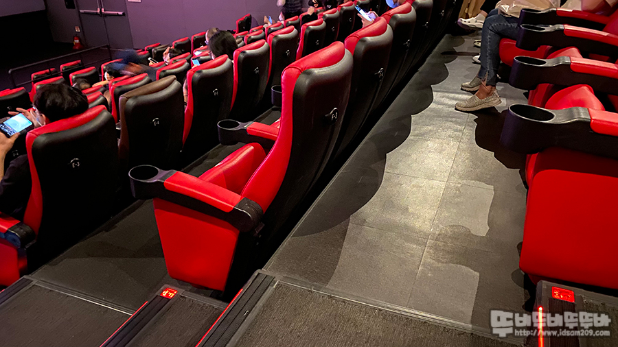 좌석 간의 간격은 편안한 편이며 좌석배치도를 보시면 알겠지만 중앙의 긴 좌서 양쪽 사이드의 두 좌석은 정면 기준 안쪽으로 약 40도? 정도 틀어져 있어 스크린 코너에서 보긴 하지만 틀어진 좌석 덕분에 보는데 불편함은 없는 편입니다.
