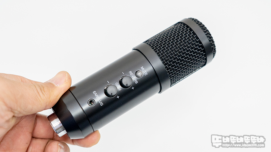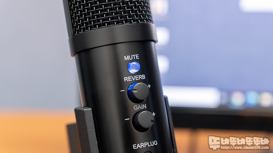 전용 소프트웨어가 없는 마이크이기에 마이크 전면에 REVERB (에코 설정), GAIN (마이크 감도)은 다이얼을 돌려서 원하는 수준으로 세팅이 가능하며 마이크에 EARPLUG로 인쇄된 3.5mm 단자에 이어폰이나 헤드폰을 연결 시 마이크의 컨디션을 빠르게 알 수 있습니다.