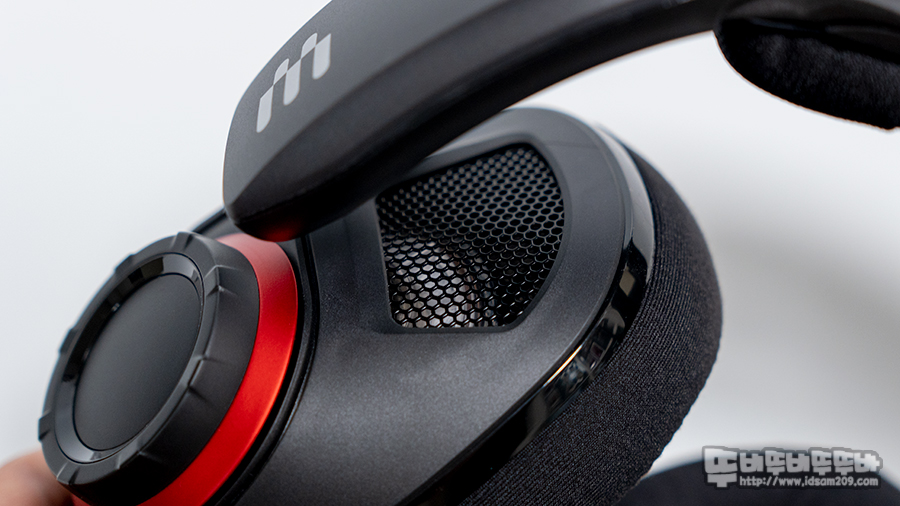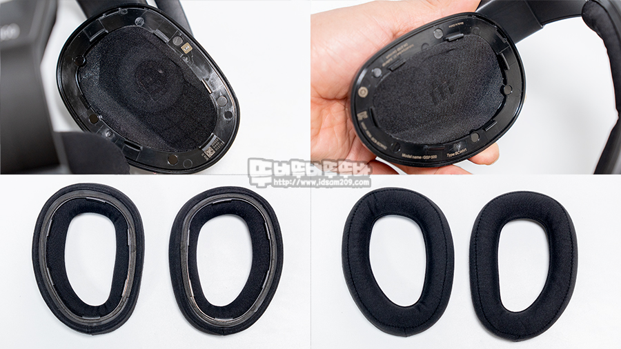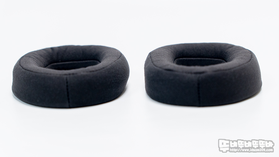 이어패드는 위/아래 기준 외경 115mm 내경 75mm 사이즈의 귀 모양 오버이어 디자인으로 플라스틱 가이드에 씌워져 이어컵 하우징과 결합되는 구조로 중앙부가 뚫려있는 형태이기에 50mm 드라이버 유닛은 별도의 매쉬망으로 보호되고 있습니다.