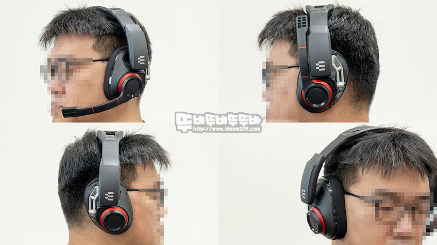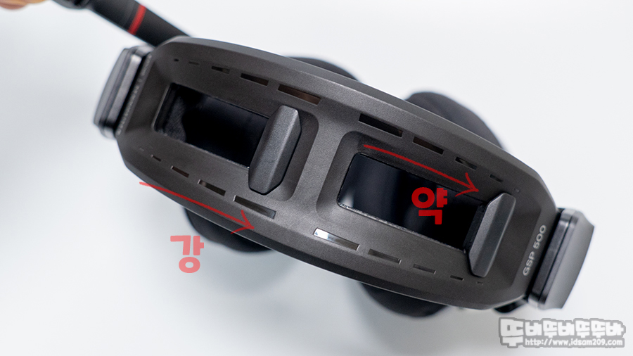 젠하이저 GSP 500 게이밍 헤드셋을 착용해보면 두상의 측면 형태에 따라 차이가 있을 수 있는데 필자의 경우 반원 느낌의 헤어밴드 때문에 그런지 이어패드 아래쪽이 밀착되는 느낌을 주고 위쪽에 살짝 뜨는 형태가 되는데 헤어밴드의 장력 조절 바를 최저로 설정하여 이어컵 하우징의 장력을 줄이니 나름 편안한 착용감을 주었습니다.