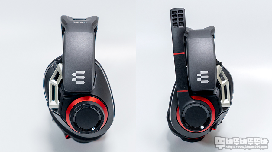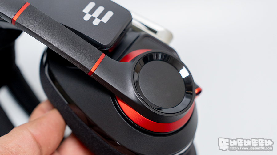 젠하이저 GSP 500 게이밍 헤드셋은 왼쪽에는 위아래로 움직이는 폴딩 방식의 마이크가 오른쪽에는 볼륨 조절 다이얼이 있어 대칭형 디자인의 모습을 보여주고 있습니다.
