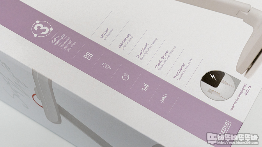 눈 보호 LED 라이팅, USB 충전 지원, 40분 타이머 지원, 5단계 디밍(밝기 조절) 지원, 터치 컨트롤 지원 등의 내용을 확인할 수 있습니다.