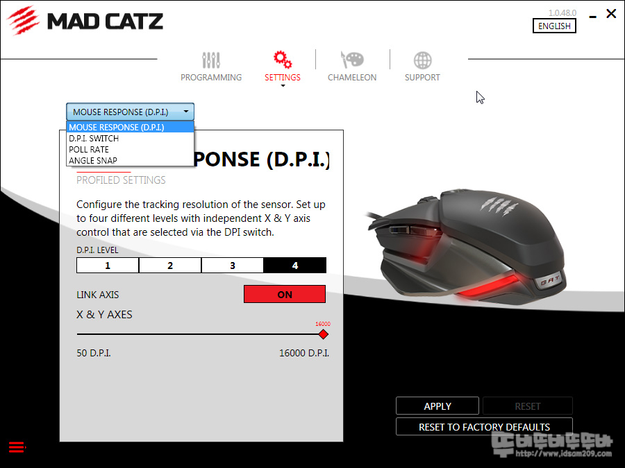 DPI는 기본 4단계를 지원하며 기본값 800/1600/3200/16000으로 설정되어있으며, DPI 변경은 빨간색으로 표시된 마름모를 좌우로 드래그하여 50단위로 변경 가능합니다.