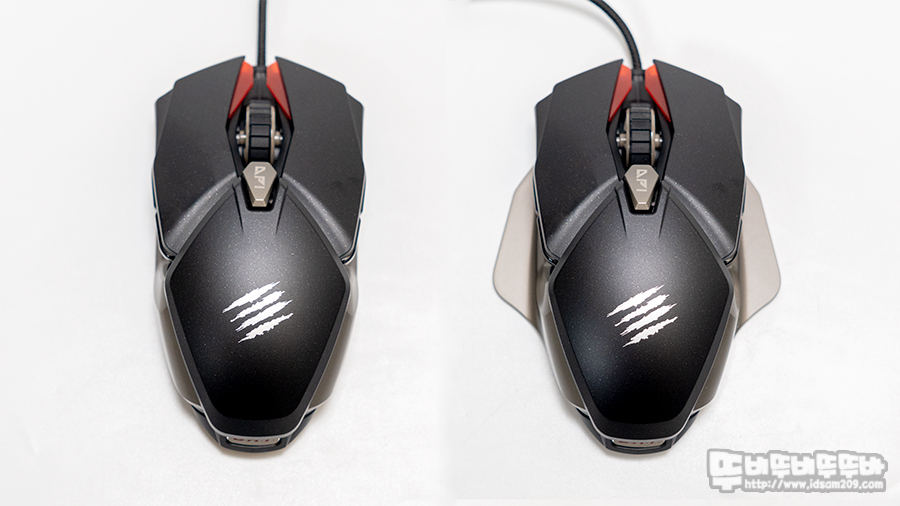 커버 내부에는 자석이 내장된 교체형 파트는 마우스 베이스에는 자석을 수용하는 나사로 위치가 고정되는 손쉬운 교체가 가능하여 알루미늄 베이스에 나사를 사용했던 R.A.T 모델보다 마우스 무게를 줄이면서 매드캐츠 마우스의 커스터마이징을 기능을 계승한 느낌입니다.