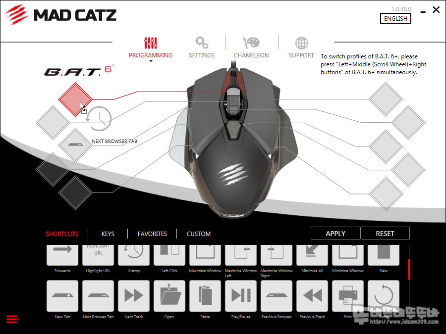 프로그램은 R.A.T 시리즈 때 사용되는 프로그램과 동일한 구성으로 프로그래밍 메뉴에서는 마우스의 10개의 버튼(휠 스크롤 기능 포함)에 프로그램 하단의 단축키/키/즐겨찾기/커스텀(매크로) 기능의 아이콘을 위지윅스 방식으로 마우스 버튼의 마름모 영역에 드래그로 기능을 부여하는 간편한 방식으로 구성되어있습니다.