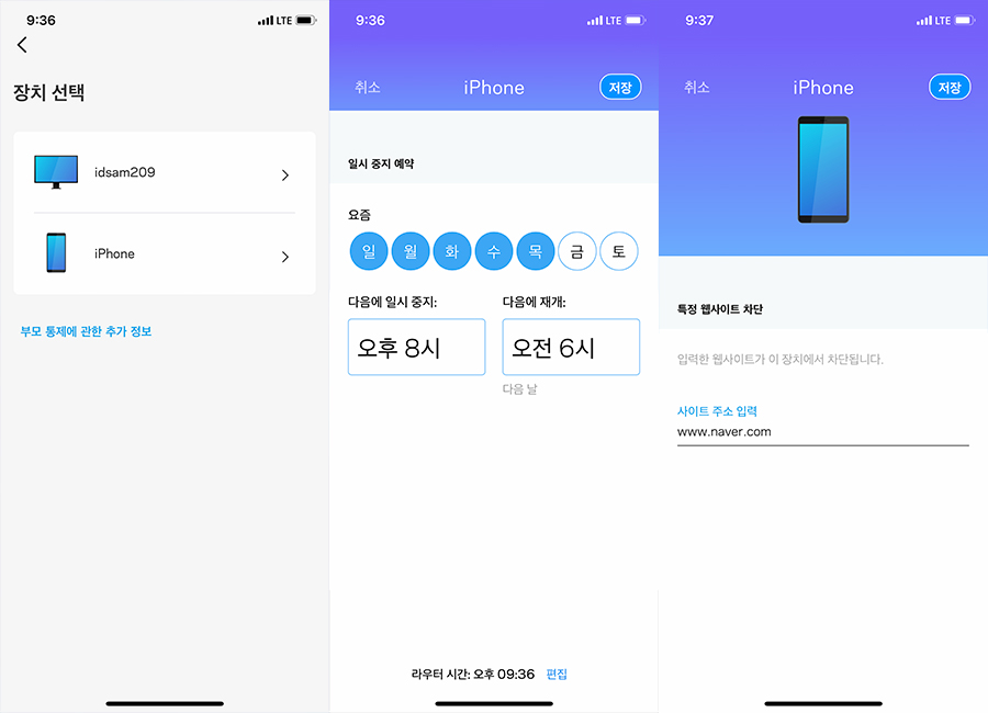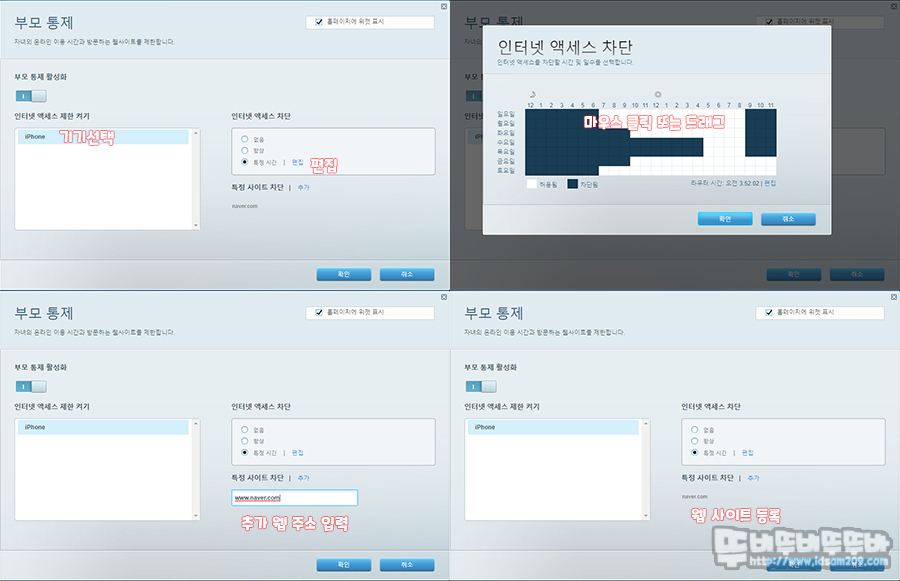 부모 통제는 접속된 기기 선택 후 통제 시간 → 편집을 눌러 요일과 시간을 마우스 클릭 또는 드래그로 차단/허용이 가능하며 웹사이트의 경우 직접 웹주소를 입력하여 차단이 가능합니다.