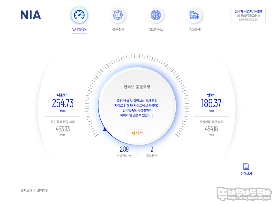 속도 측정 사이트를 이용하지 않더라도 자체적으로 지원하는 속도 점검 기능을 이용하여 업/다운 속도 측정이 가능합니다.