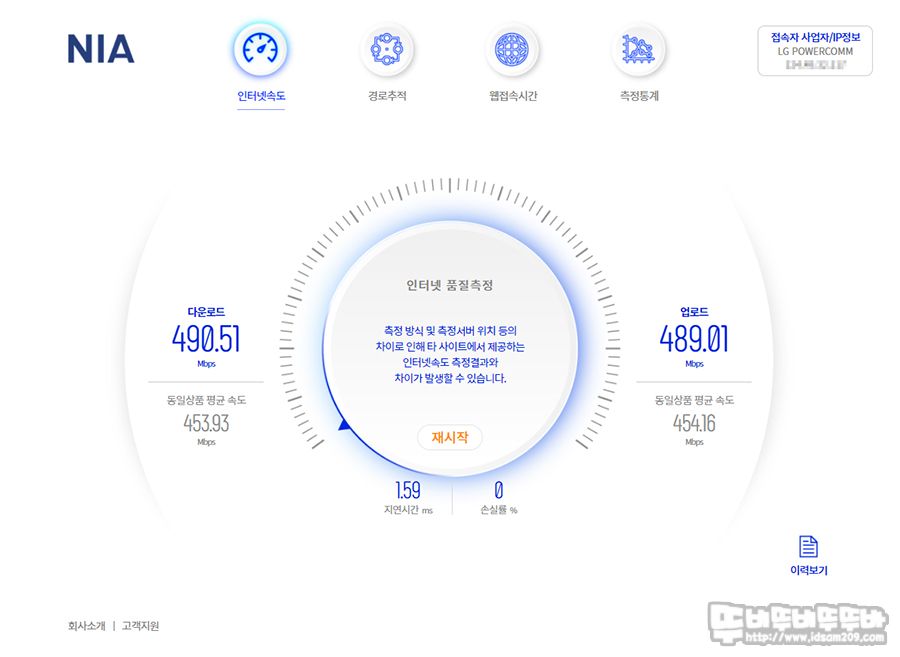필자는 LG U+의 기가슬림 (500Mbps) 서비스를 사용 중이며 유선으로 인터넷 속도를 확인 시 다운로드 490Mbps, 업로드 489Mbps로 기가슬림 서비스에 준하는 속도를 보여주고 있습니다.