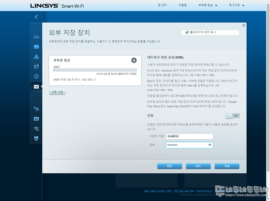 USB 포트를 이용한 외부 저장 장치는 사용자 이름과 암호를 설정 후 SMB 방식으로 접속이 가능한데요.