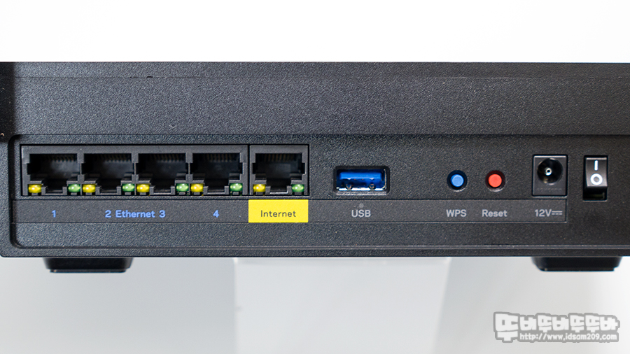 기가비트 랜 포트 4개 / 통신사 인터넷 선이 연결되는 Wan 포트 1개 / USB 3.0 포트 / WPS 및 리셋 버튼 / 전원 소켓 / 전원 스위치 구성을 확인할 수 있습니다.