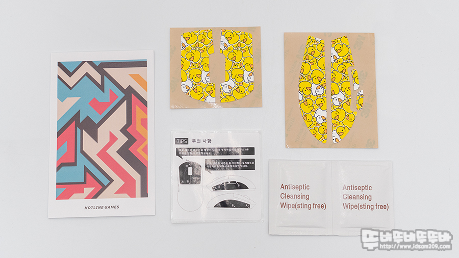부착하는 설명서와 마우스 표면 클리닝용 알코올 페이퍼 2개를 기본으로 제공하고 있습니다.