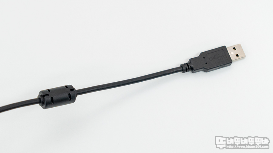 제품에는 일반적인 PVC 케이블이 중앙에 일체형으로 부착되어있으며, USB 케이블 끝부분에는 전자파 유입을 차단하는 페라이트 코어가 부착되어있습니다.