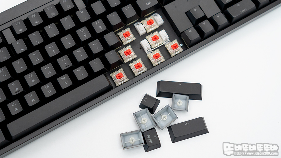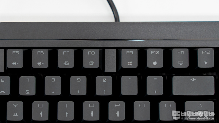 이전에 MX BOARD와 비슷한 위/아래/좌/우가 슬림하게 디자인된 모습으로 체리 MX RGB 스위치가 적용된 모델답게 RGB LED 투영을 위해 ABS 코팅이 적용된 키캡을 사용하고 있습니다.