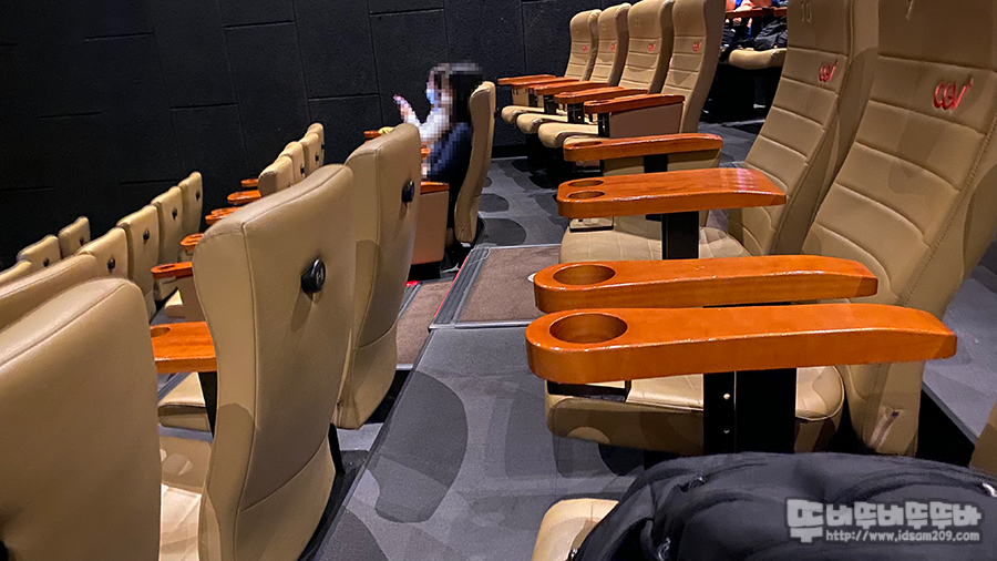 가죽 시트를 사용한 좌석은 앞뒤 좌우 간격이 넓은 편이며 각 좌석마다 양쪽 팔걸이는 제공하여 편안한 영화 관람이 가능합니다.