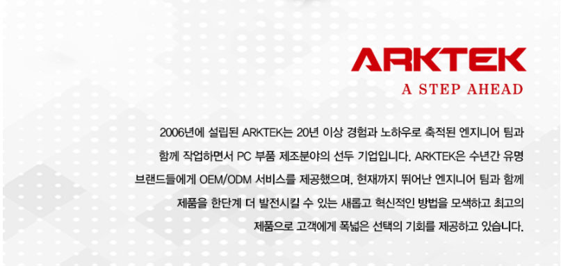 특히 ARKTEK 브랜드는 20년 이상의 축적된 노하우로 PC 부품을 제조하는 업체로 안정적인 서비스를 지원하는 STCOM에서 3년의 품질보증을 지원합니다.
