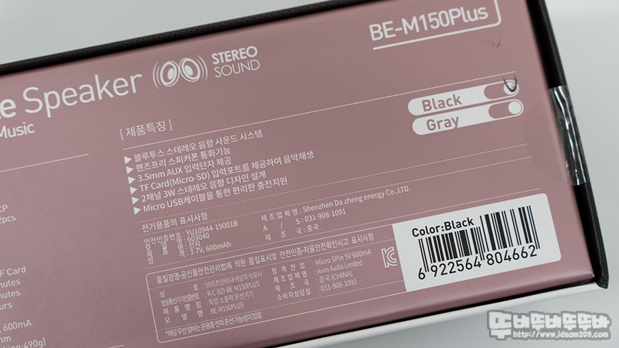 패키지 바닥면에 모든 정보가 있어 대표적으로 살펴보면 블루투스 5.0, RMS 3W, 핸즈프리, 2 채널 스테레오, 3.5mm AUX, TF Card 지원, 패시브 라디에이터, 배터리 내장 등의 포인트 설명과 스펙 정보를 확인할 수 있는데요.