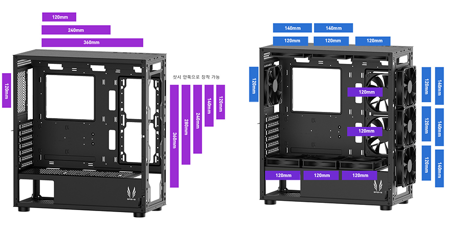 일반 공랭 쿨러의 경우 120mm / 140mm 쿨러 장착이 가능하며 내부 HDD 가이드를 제거하여 쿨러로 대체도 가능합니다.