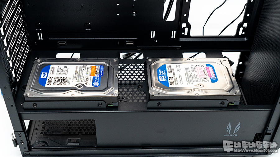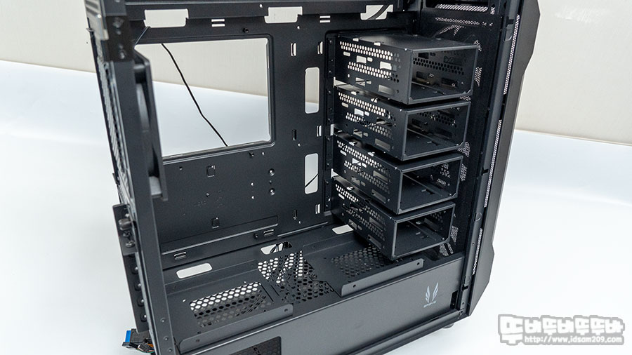 파워서플라이가 장착되는 하단 챔버 안쪽의 HDD 가이드는 샤시 안쪽의 HDD 가이드와 비슷하지만, 바닥에 고정하는 구조가 있어 서로 호환이 안 되며 HDD는 최대 3개 장착이 가능합니다.