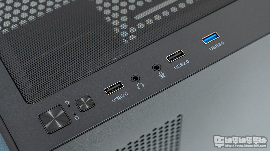 케이스의 I/O 포트는 전원 버튼 / LED 인디케이터(파워/HDD) / 리셋 버튼 / USB 2.0 포트 / HD AUDIO 포트 / USB 3.0 포트로 구성되어있습니다.