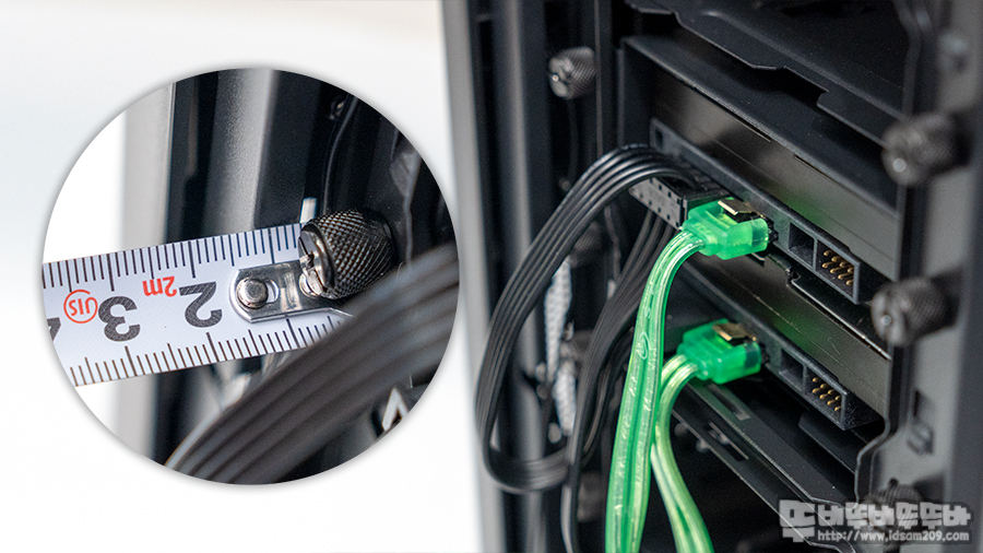 HDD 가이드가 결합되는 샤시 뒤쪽 부분과 사이드 패널이 닫히는 공간에 약 2cm 정도로 HDD를 많이 장착하는 경우 같은 위치에 중첩되는 케이블이 사이드 패널을 닫는 데 불편함을 줄 수 있을 거 같은데, HDD 가이드 2개 정도는 사이드 패널이 닫히는 데 문제가 없으니 HDD를 여러 개를 장착하는 경우 케이블이 중첩되지 않게 잘 정리하면 괜찮을 거 같습니다.