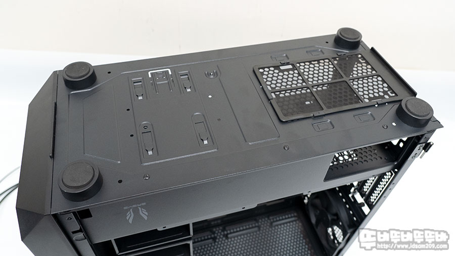 샤시 상단은 120 / 140mm 쿨러 및 수냉 라디에이터 장착이 가능한 구조로 되어있으며 고무 자석을 이용한 먼지 필터를 기본으로 제공하고 있습니다.