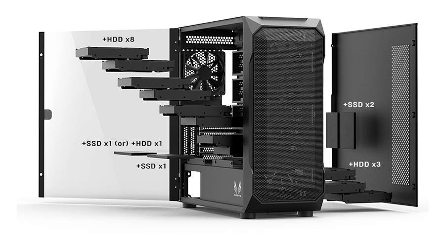 205 X 487 X 480mm 크기의 미들 케이스로 ITX ~ ATX 메인보드와 165mm 타워형 CPU 쿨러 수용이 가능하며, 내부 샤시 전면에 8개의 HDD 베이가 있음에도 300mm 길이의 VGA 카드 수용할 수 있지만, HDD 베이 탈착으로 VGA 또는 샤시 상단 수냉 쿨러 사용이 가능합니다.