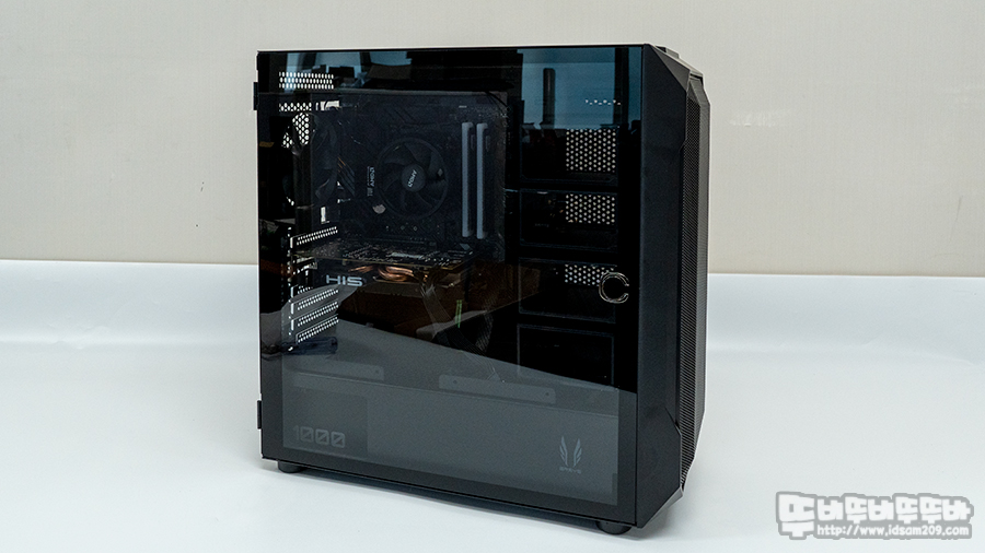 측면 강화유리 패널은 경칩을 이용한 스윙도어 디자인으로 패널 앞쪽에 손잡이 클립과 패널 안쪽에 자석이 내장되어 샤시 프레임에 자석으로 고정되는 구조로 되어있어 간편하게 사이드 패널을 개폐할 수 있는데 특징을 가지고 있습니다.