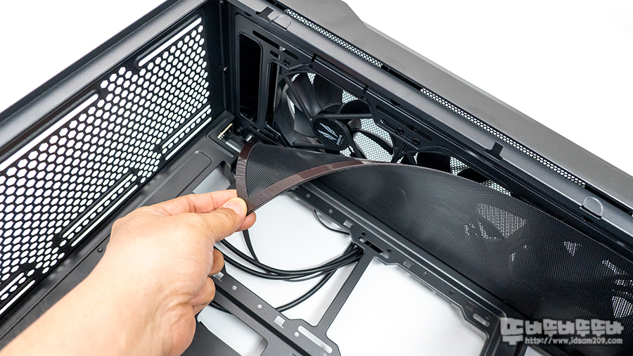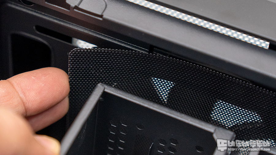 전면 베젤에서 제공하지 않았던 먼지 필터는 샤시 안쪽에 고무 자석을 이용하여 부착되어있는데 HDD 가이드가 있더라고 탈부착이 가능하며, HDD 가이드를 모두 제거하면 좀 더 쉽게 탈부착이 가능하니 참고하시기 바랍니다.