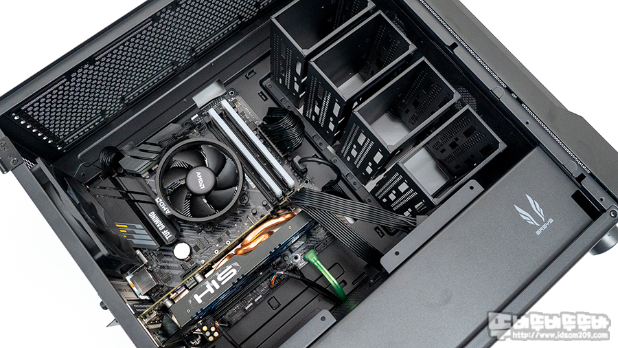 샤시 전면에 HDD 가이드 안 쪽 상단으로 SSD를 뒤집어 장착이 가능하기에 HDD와 SSD 조합으로 부족함 없는 저장장치 사용이 가능합니다.