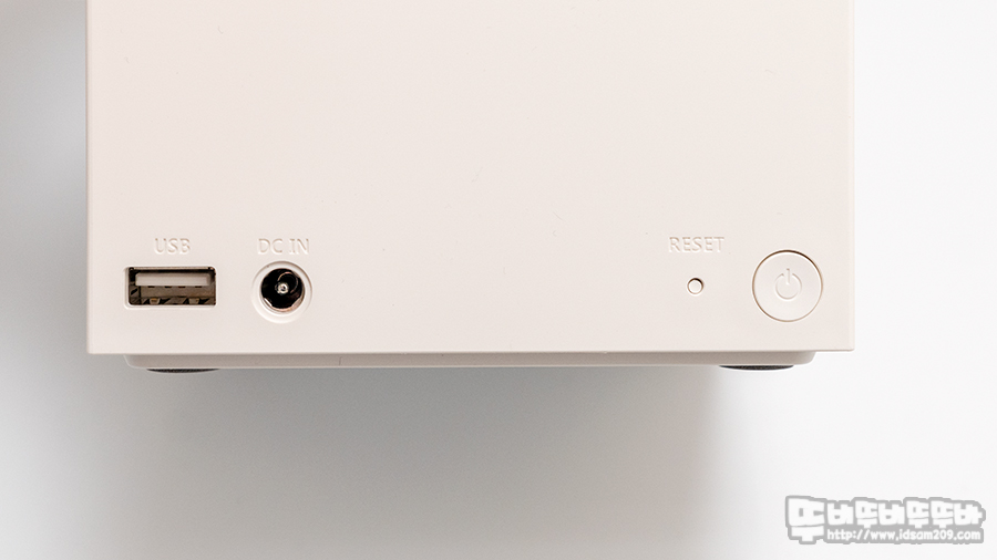 제품 뒷면에는 컴퓨터와 연결하는 USB-A 단자, DC 전원 소켓, 리셋 버튼과 전원 버튼이 있으며, 바닥면에는 미끄럼을 방지하는 패드가 부착되어있어 프린트 사용 시 흔들리거나 밀리지 않고 안정적인 사용이 가능합니다.