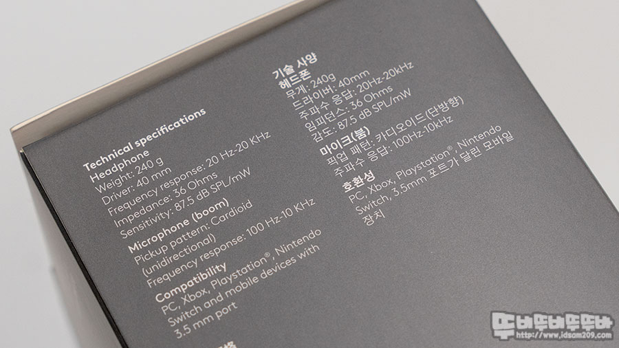 드라이버 40mm / 주파수 응답 : 20Hz~20kHz / 임피던스 36Ω / 감도 87.5dB / 마이크 픽업 패턴 : 카디오이드(단방향) 마이크 주파수 응답 100Hz~10kHz / 플립 방식 마이크 On, Off / 연결방식: 3.5mm / 무게:240g 정보를 확인할 수 있습니다.