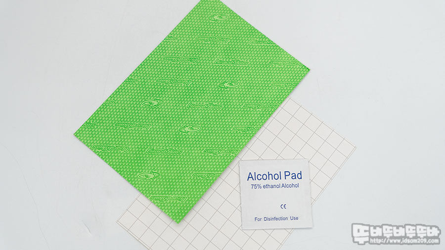 제품은 100 x 150mm 사이즈의 DIY 그립 시트지와 알코올 페이퍼, 마우스 표면에 부착하여 접착면은 도안 작업을 할 수 있는 시트지 그리고 사용설명서로 구성되어있습니다.