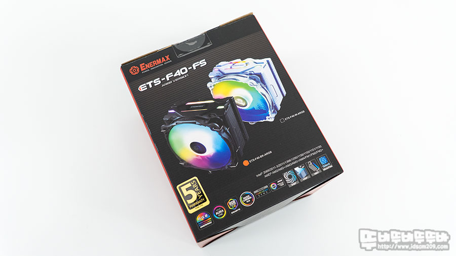 에너맥스 ETS-F40-FS ARGB CPU 쿨러 패키지 전면에는 제품의 모델과 컬러 표시 5년 서비스 보증 그리고 Addressable RGB 지원 내용, 쿨러에 적용된 VGF, VEF, HDT, 저소음 쿨링팬 그리고 인텔과 AMD 지원 소켓 정보를 확인할 수 있습니다.