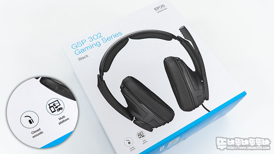 EPOS 젠하이저 GSP 302 게이밍 헤드셋 패키지에는 제품의 이미지와 밀폐형 및 멀티 플랫폼을 지원하는 내용과 측면에는 제품의 스펙 정보를 확인할 수 있습니다.