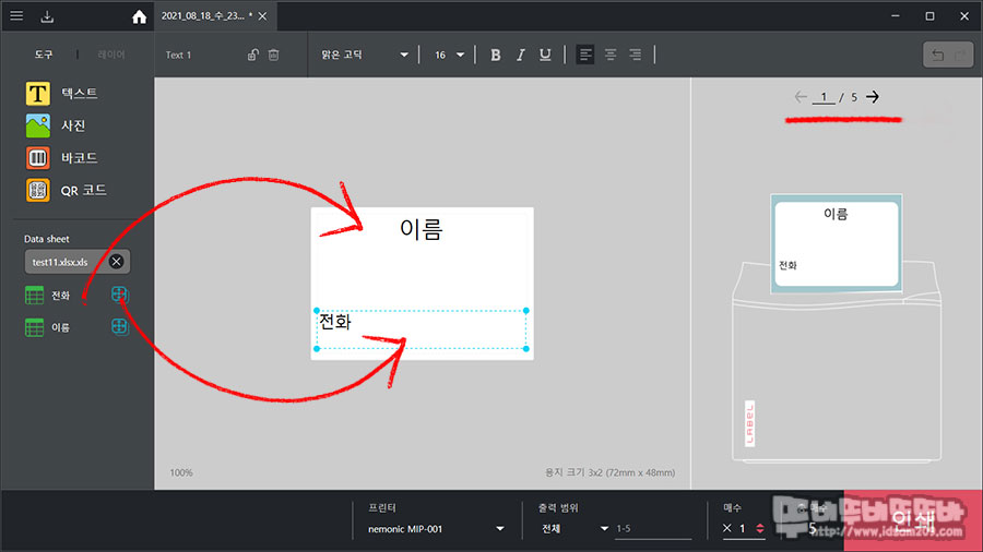 먼저 엑셀 파일이 로딩되면 왼쪽에 엑셀에 작업한 이름과 전화번호 필드명이 나타나며 오른쪽 상단에 1/5로 5명의 데이터가 있음을 표현하고 있습니다.
