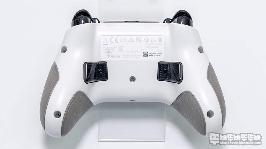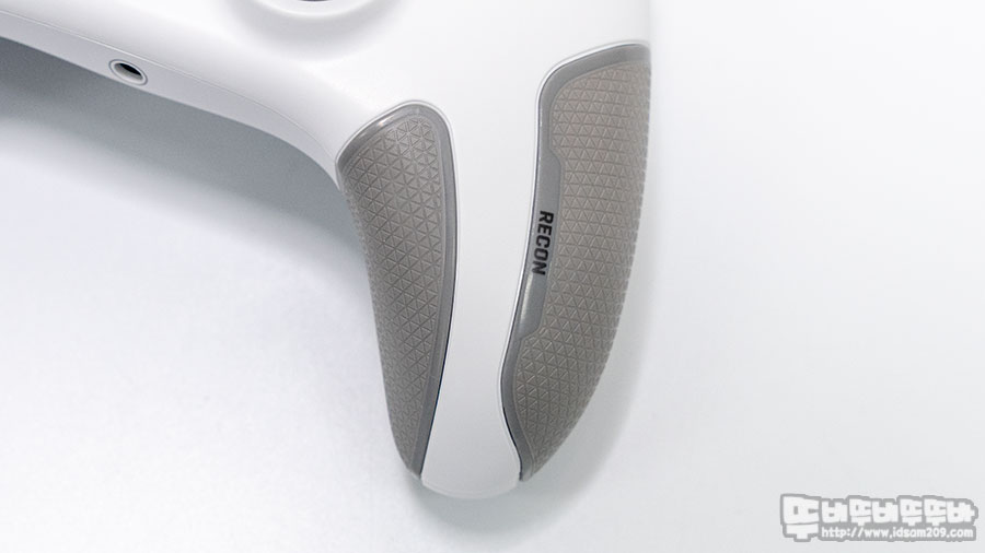 바닥면에는 터틀비치 리콘 컨트롤러의 포인트 기능인 Pro-AIM 버튼 및 퀵 액션 맵핑 버튼은 컨트롤러 그립 시 바닥면에 돌출된 스위치를 누르는 형태라 전체적인 그립이 풀리지 않은 상태에서 사용할 수 있는 편리함에 버튼 기능을 맵핑하여 사용하거나 게이밍 마우스에 종종 등장하는 스나이핑 모드와 같이 화면 시점을 4가지 단계로 조절하여 천천히 섬세하게 조절할 수 있습니다.