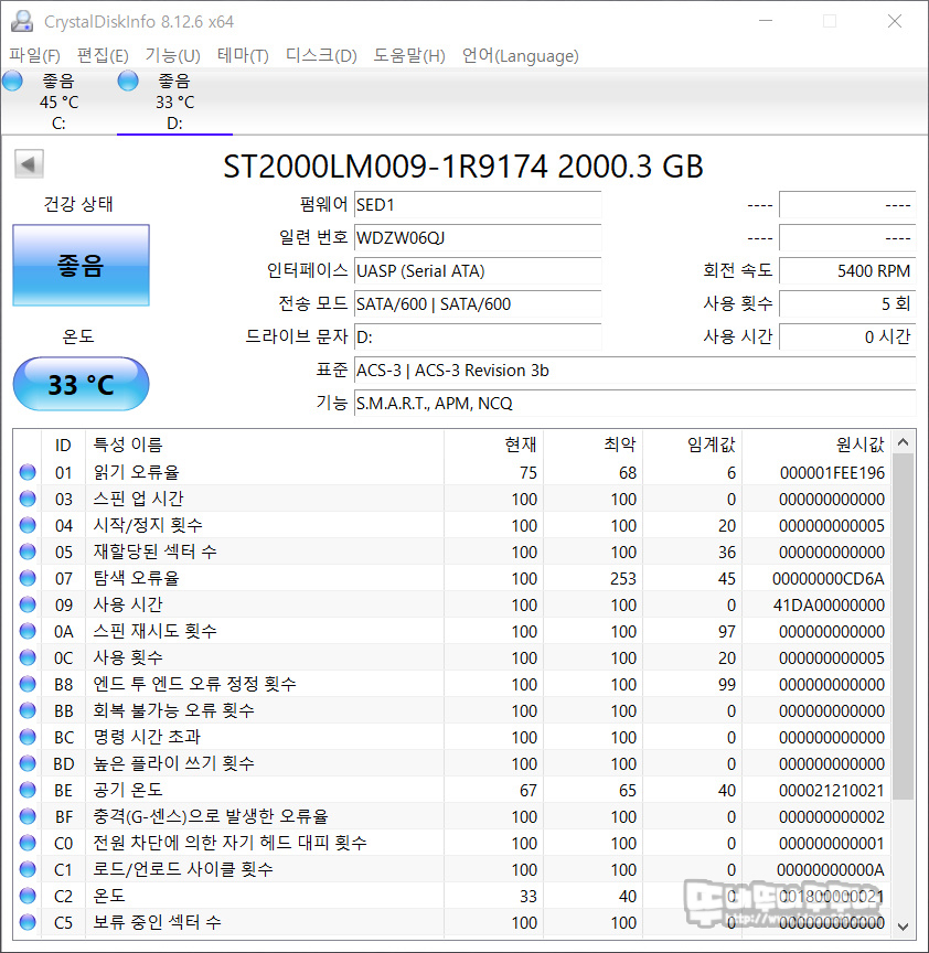 CrystalDiskInfo로 제품의 정보를 살펴보니 5G 전송속도를 보여주는 SATA 방식의 5400rpm 2.5인치 HDD 내용을 확인할 수 있으며 CrystalDiskMark 테스트에서는 HDD의 속도를 체감할 수 있는데요.