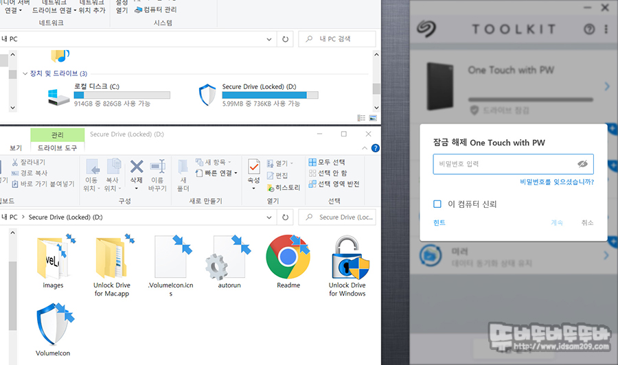 씨게이트 One Touch HDD를 사용하는데 도움을 주는 Toolkit 프로그램을 설치하면 디스크 관리에서 암호화 설정, 백업과 미러 복사 그리고 백업 복원 등의 기능을 사용할 수 있는데 그중에서 휴대 중 분실을 대비한 암호화 작업은 나름 필수라 할 수 있습니다.