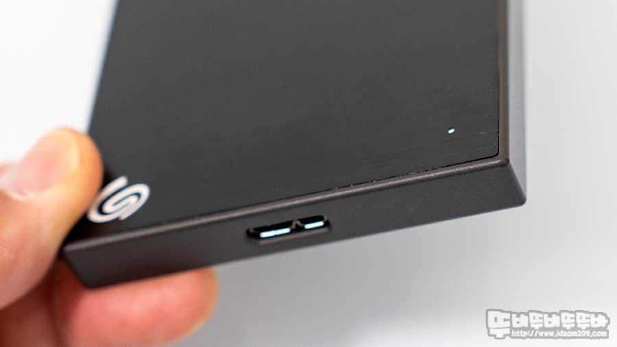 전면에 적용된 메탈은 절곡으로 하단부까지 커버하고 있으며 Micro B (10핀) 소켓이 있는 위쪽에는 씨게이트 로고와 USB 연결 시 작동상태를 알려주는 LED 인디케이터 홀이 눈에 띕니다.