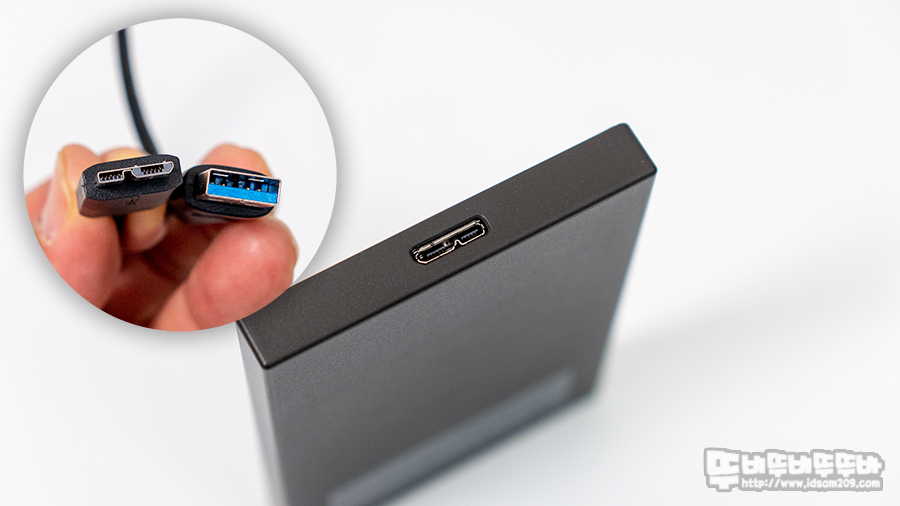 Micro B (10핀) to USB-A 케이블과 씨게이트 One Touch HDD의 Micro B (10핀) 연결 소켓 모습.