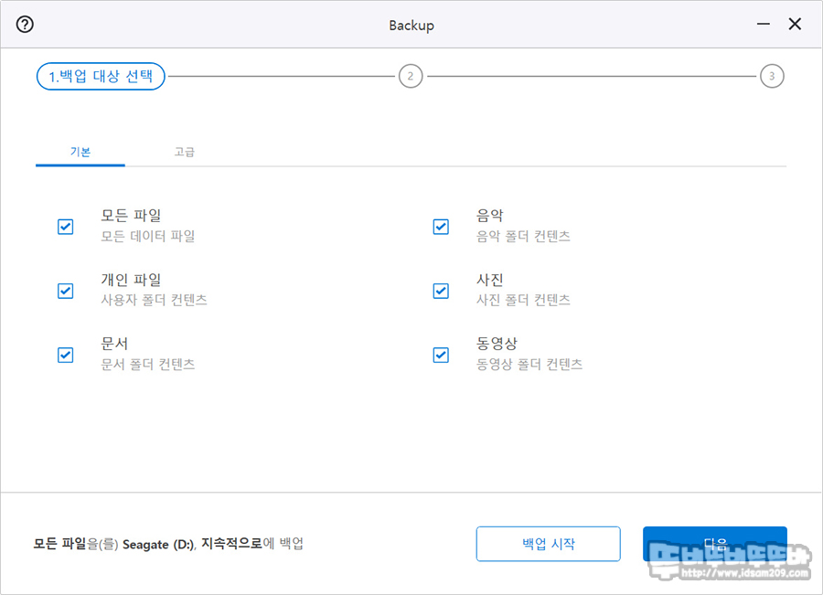 휴대용 HDD임을 감한하면 모든 파일을 백업하는 것 보다 개인의 중요 파일 또는 작업 파일 또는 관련 파일이 담겨있는 지정 폴더를 대상으로 백업하는 게 좋습니다.